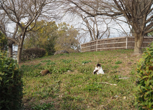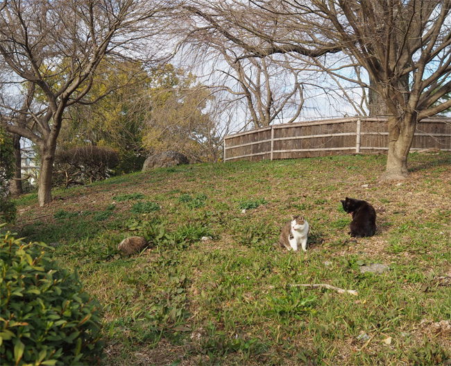 お昼の公園、猫さんたちが日向ぼっこをしながら寛いでいます。