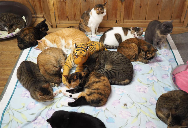 小屋の中に入るとすごい光景が。猫絨毯です。