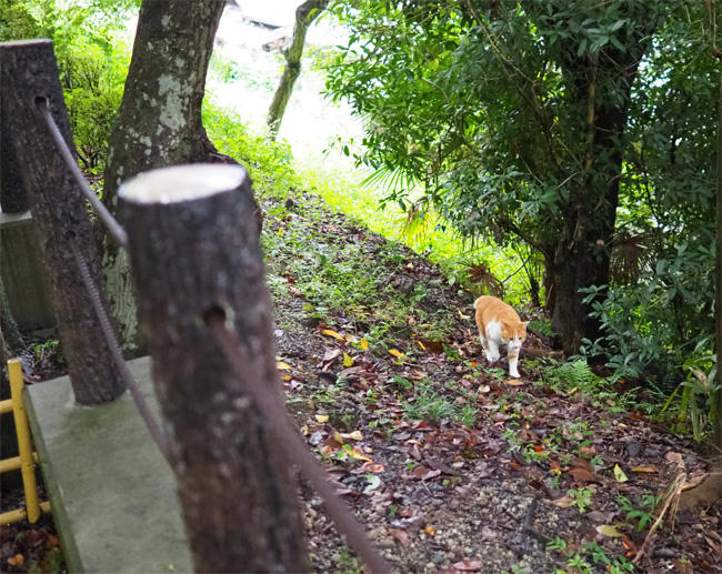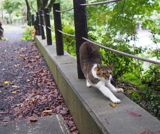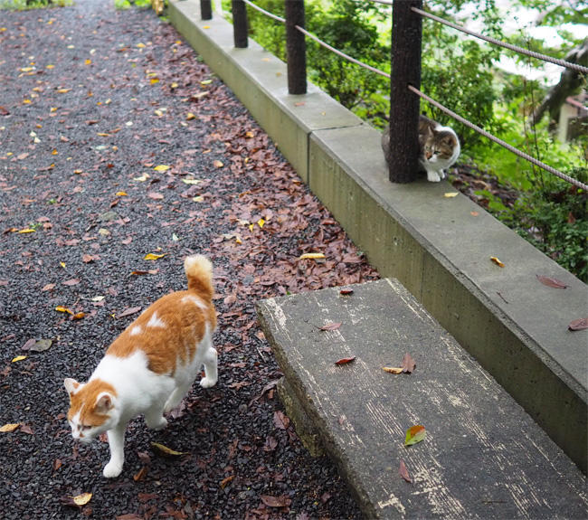 雨上がりの遊歩道、外側の斜面から茶白さんが動き出します。
