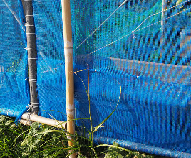 仕切りネットの向こう側にキジトラさんが見えます