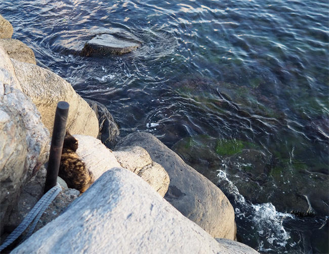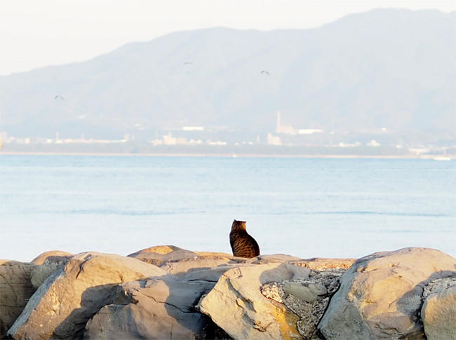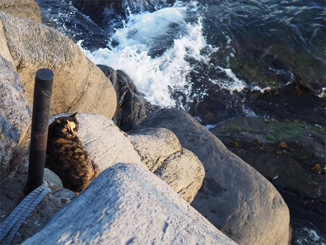 岩場にちょこんと乗っている猫さんが見えます。