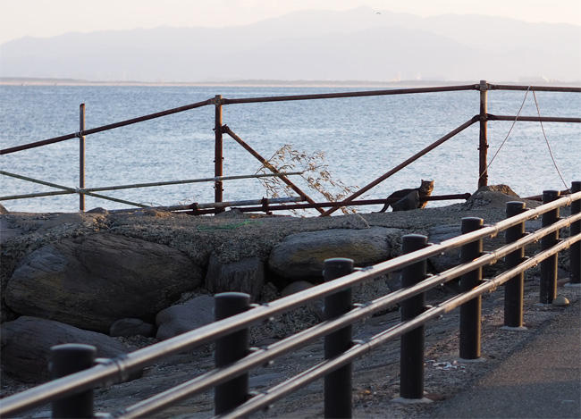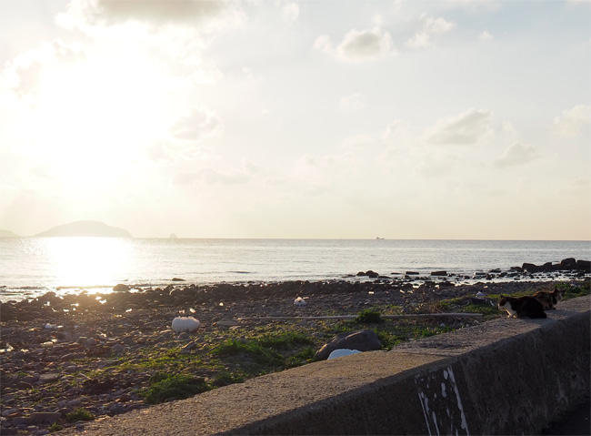 夕日の見える海岸のブロックの上にも猫さんたちです。
