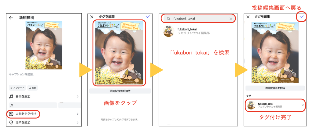撮影した写真にフカボリトウカイのアカウント(@fukabori_tokai)をタグ付けし、メッセージにハッシュタグ「#幸せの黄色い花束キャンペーン2026」をつけて、大切な方へのメッセージや国際女性デーへの想いなどを添えてInstagramで投稿してください。