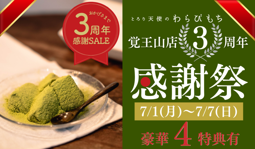 「とろり天使のわらびもち 覚王山店」3周年感謝セールの特典をチェック!
