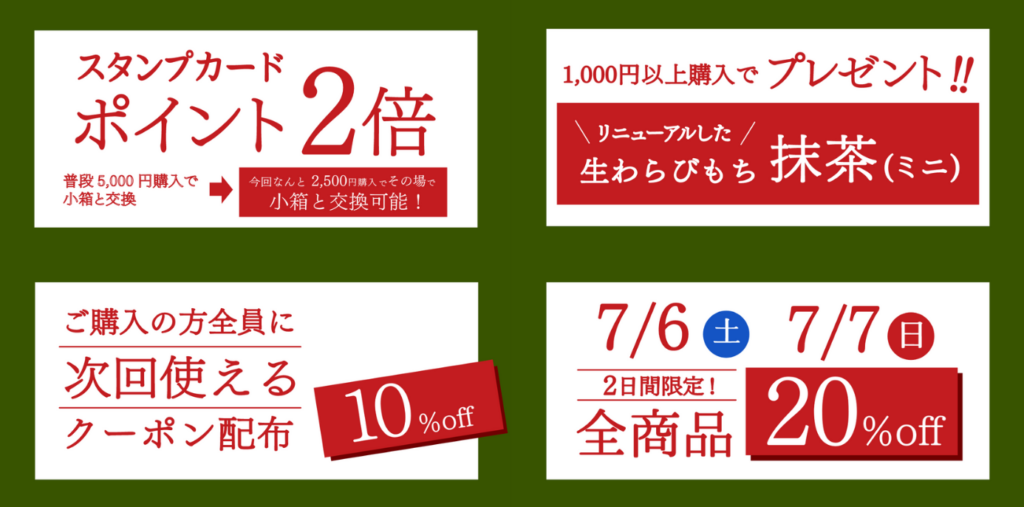「とろり天使のわらびもち 覚王山店」3周年感謝セールでは7日間限定で、店舗で配布されるチラシを提示するとポイント2倍や1000円以上購入で人気商品のプレゼントなど4つの特典がありますよ。