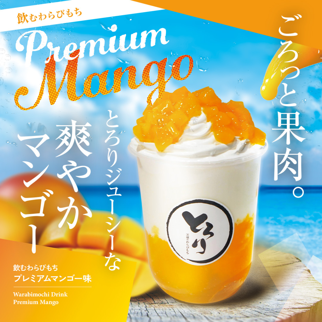 「とろとろすぎて、ストローで飲めるのでは」との想いから誕生した新感覚の飲むスイーツ。カップの底にわらびもちを入れたドリンクに、生クリームをトッピングした映える見た目と新食感が話題の「飲むわらびもち」は、通常フレーバーは「ミルクティー」「黒蜜」「抹茶」ですが、期間限定で「プレミアムマンゴー」が登場します。2024年7月1日(月)~8月末頃販売終了予定(※在庫無くなり次第終了)のため、気になる方は早めにチェックしてみてください。