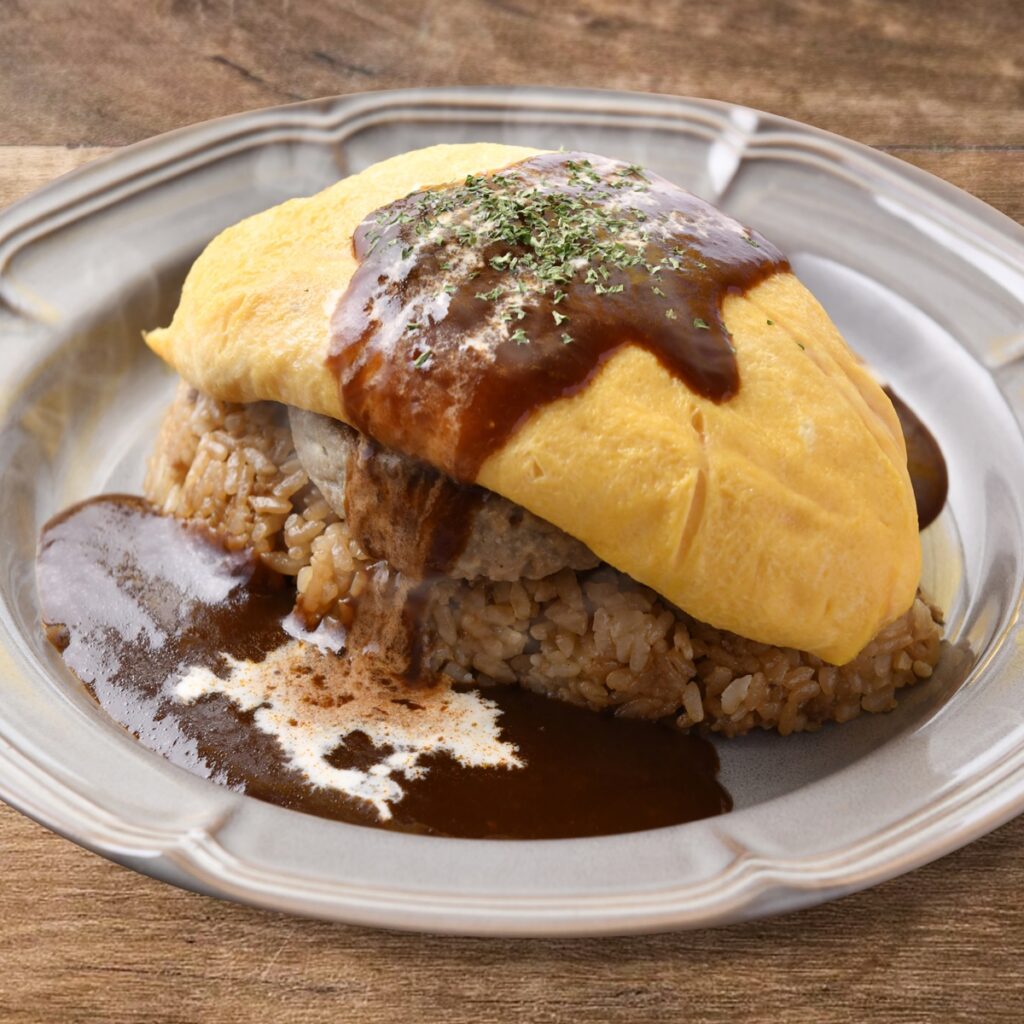 看板メニューは卵とソースのコントラストが鮮やかな「デミグラスソースのオムライス」1,480円(税込)。贅沢に卵を3個使用し、とろとろ半熟に焼き上げたオムレツは、ナイフを入れた瞬間にあふれるふわとろ卵と、深みとコクのあるデミグラスソースの相性も抜群。