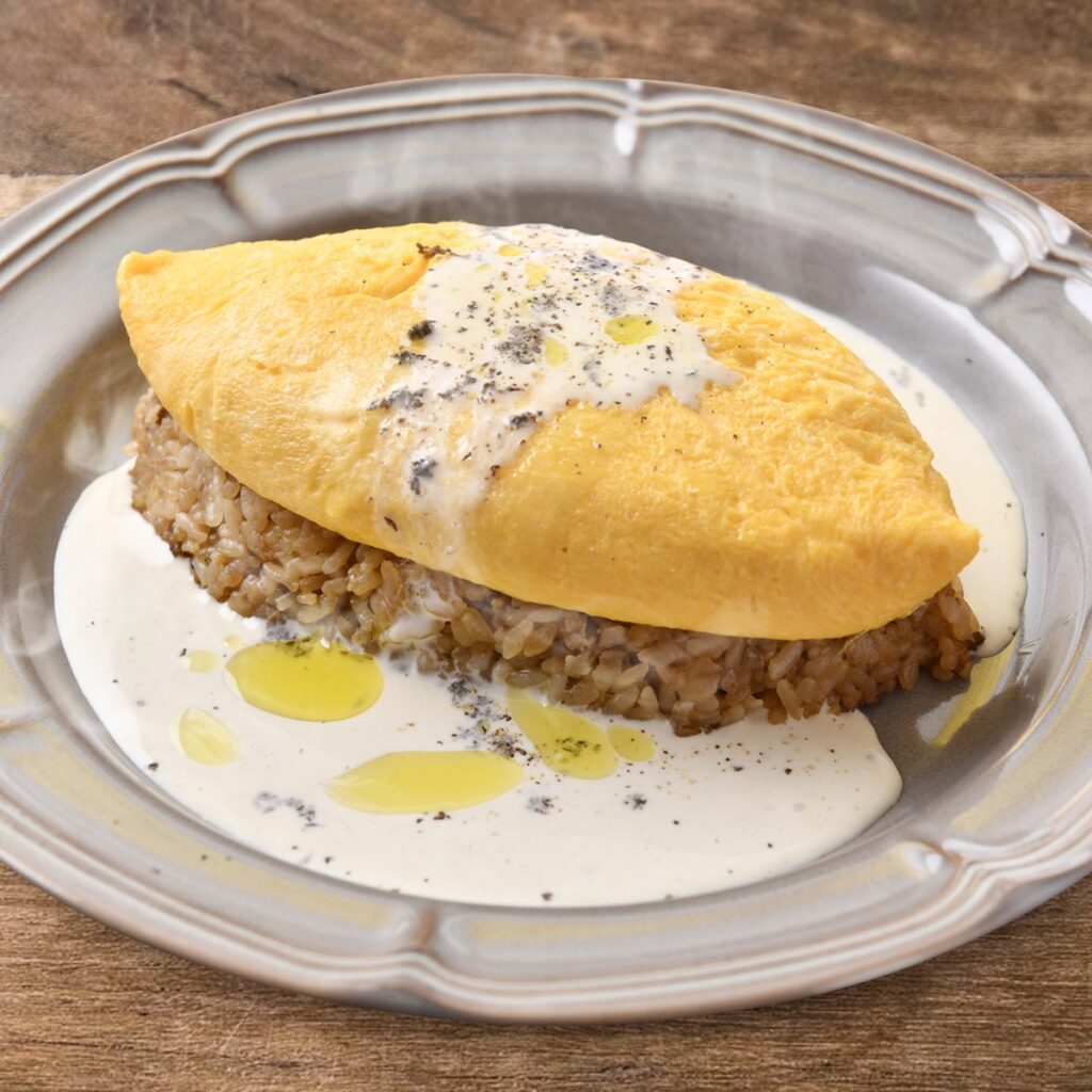 「トリュフチーズソースのオムライス」 1,580円(税込)は、芳醇なトリュフの風味を効かせたチーズソースがシンプルな味付けのオムレツと相性抜群。とろとろ卵の食感と鼻を抜けるトリュフの芳醇な香り、口の中で広がる旨味は格別のおいしさです。