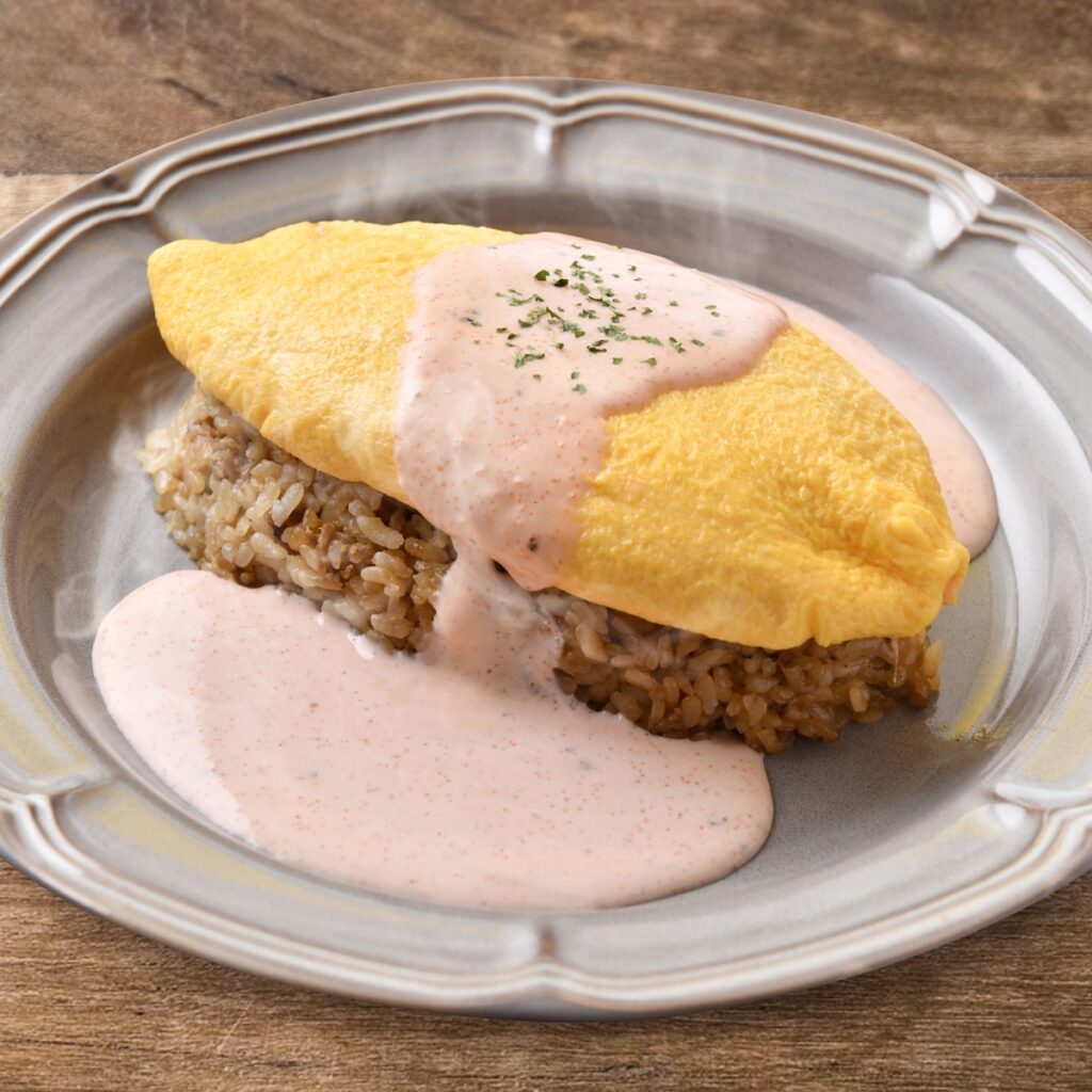 明太子の塩味とクリームソースのまろやかさのバランスが絶妙な「明太クリームのオムライス」1,680円(税込)。卵の黄色と明太子をたっぷり入れたピンク色のチーズソースが見た目も可愛らしく演出します。