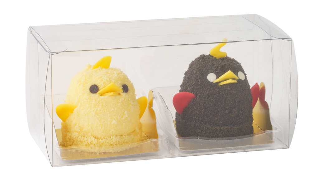 愛知県の地元食材「名古屋コーチン」の卵を使ったプリンを、バニラの香り豊かなババロアで包み込み、粉末状にしたスポンジをまとわせた、ふんわり「ひよこ」の形に飾り付けた生スイーツ。