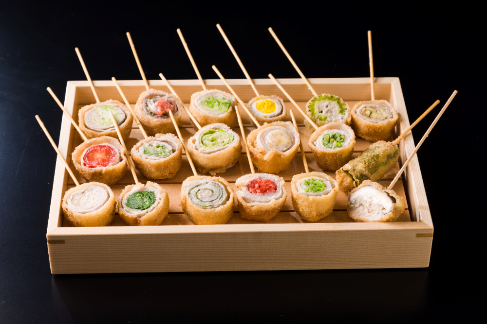 肉と野菜を一緒に楽しめるひと口サイズのピンチョススタイルの串揚げ。細かい衣で素材を引き立て、ワインとの相性も抜群です。