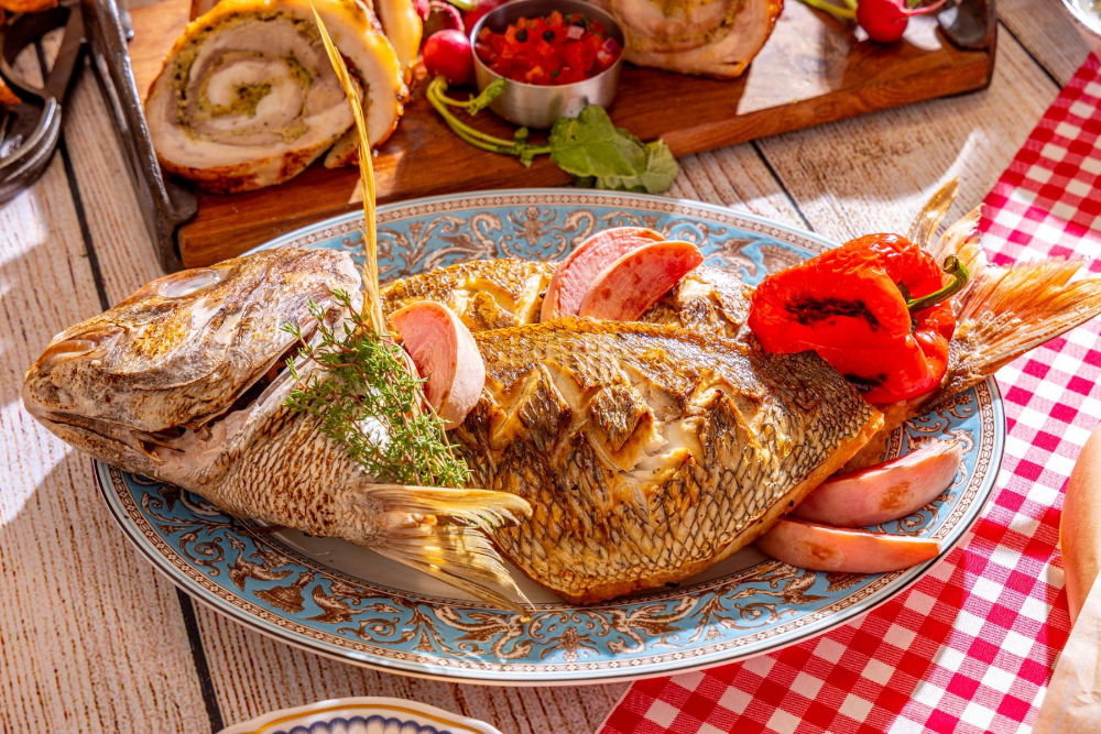 皮がパリパリの鯛に、赤パプリカとアンチョビの香り高いソースが添えられます。