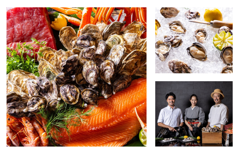 総料理長 佐藤弘二さんが厳選した2種類のブランド牡蠣「海男オイスター」(佐賀県有明海産)と「朋輩牡蠣」(愛知県篠島産)を、牡蠣剥き職人(オイスターシャッカ―)が目の前で剥くライブパフォーマンスが見どころです。ワインや日本酒などのアルコールと合わせて楽しめます。