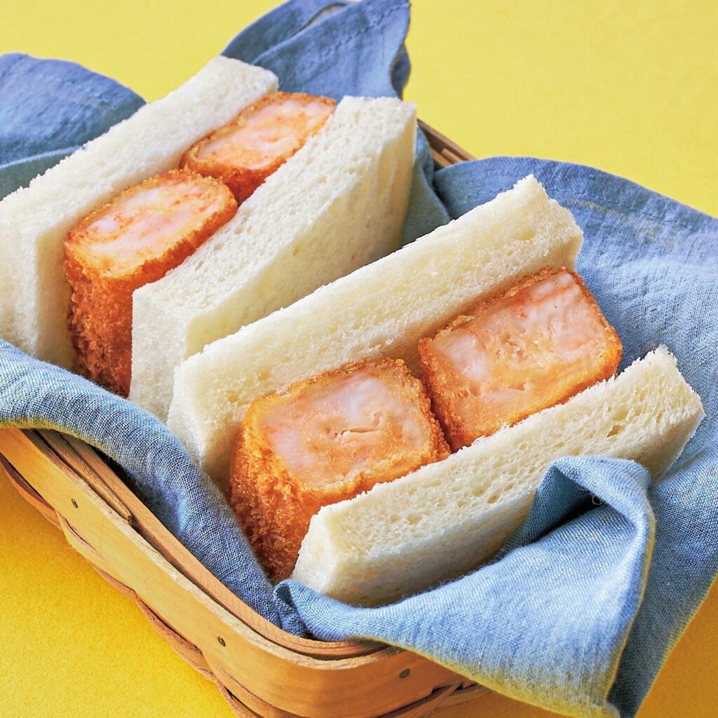 「BANKAKU KITCHEN」で二番目に人気の「海老カツサンド」1個/540円(税込)。サクッとした衣に海老の身と帆立の旨みがぎゅっと詰まった海老カツをこだわりの一等小麦粉食パンでサンドした一品。