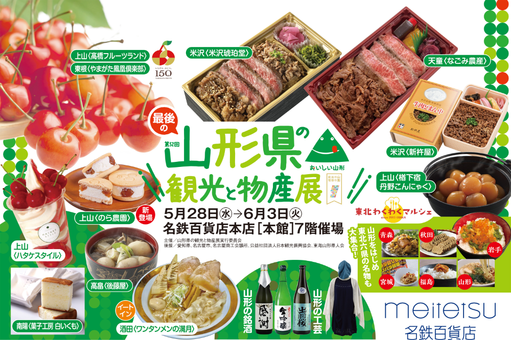 2025年5月28日(水)から6月3日(火)まで、名鉄百貨店本店[本館]7階催場で「第52回 山形県の観光と物産展」が開催されます。旬を迎えた甘酸っぱいさくらんぼをはじめ、山形牛・米沢牛のグルメ、伝統工芸品など、山形の魅力が詰まった全39店舗が集結します。名鉄百貨店最後の山形物産展で、東北の味と技を存分に楽しめる7日間です。
