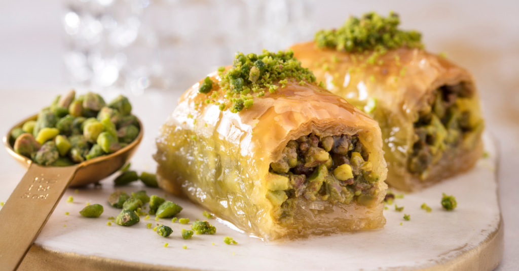 「バクラヴァ」は、薄いパイ生地を手作業で幾層にも重ね、砕いたピスタチオやくるみを挟んで焼き上げ、甘いシロップをかけて仕上げたトルコの伝統菓子です。