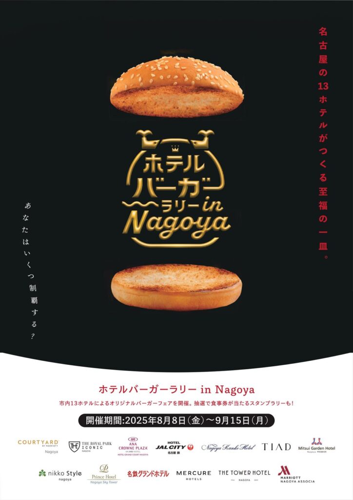 名古屋市内13のホテルの合同イベント「ホテルバーガーラリー in Nagoya」が、9月15日(月・祝)まで開催中! 各ホテルで、個性溢れるオリジナルハンバーガーが提供されています。さらに、参加ホテルのお食事券が当たるスタンプラリーも!この夏、素敵なホテルのレストランで、気軽にハンバーガーの食べ比べを楽しんでみませんか?