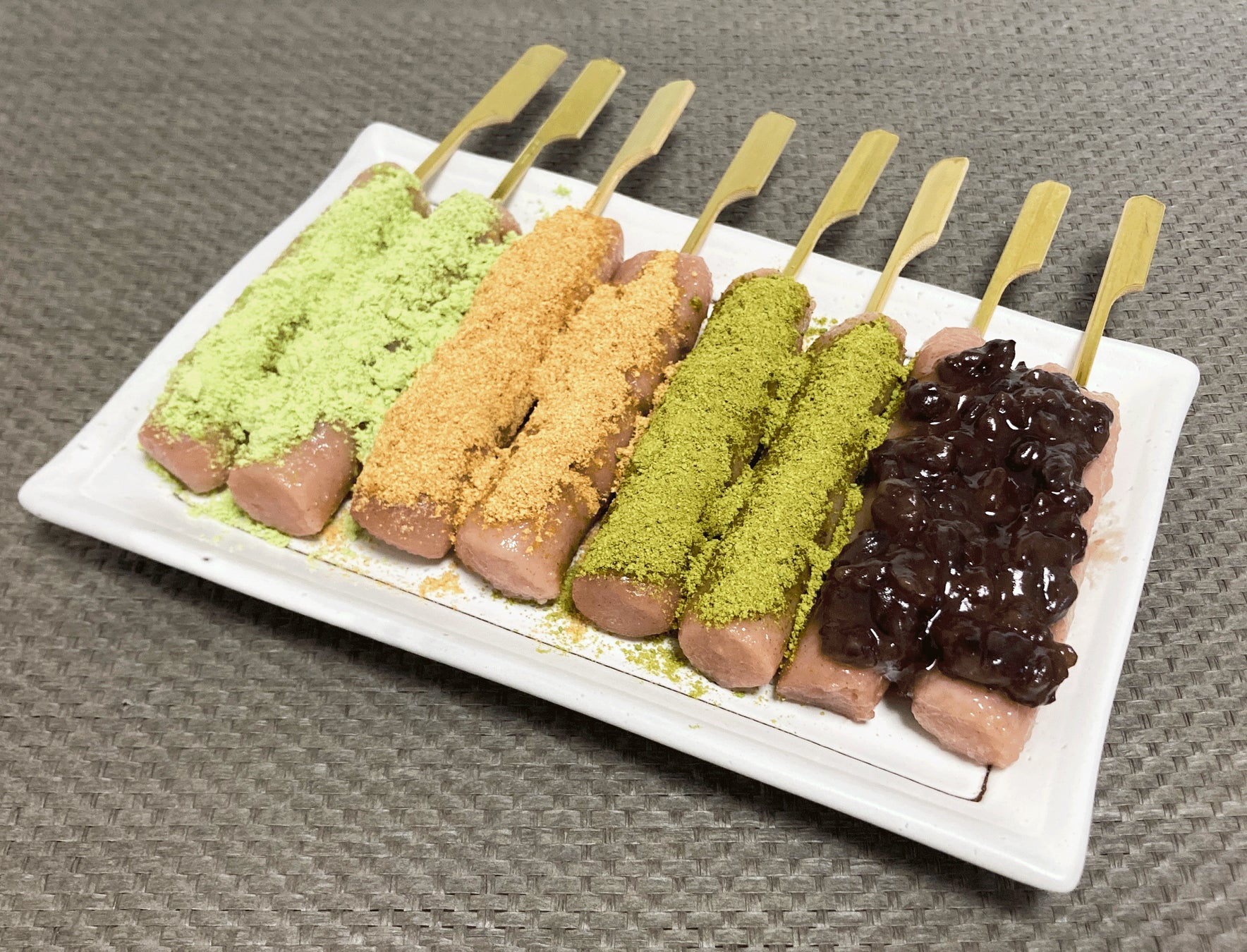 国産のたかきびを使用している手作りのピンク色の団子に、きなこやあんこなどをたっぷりとトッピング。