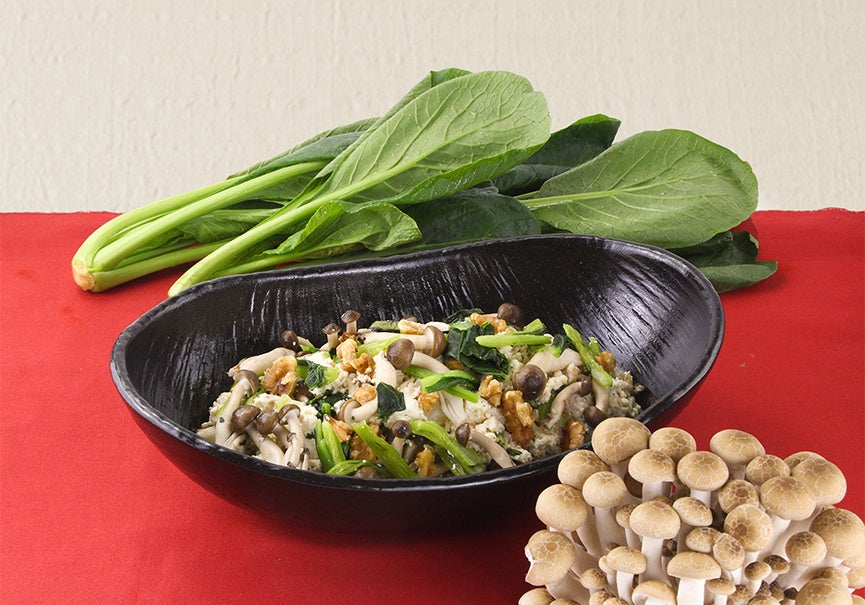 すりごまや西京味噌で味付けした白和えに、小松菜、しめじ、くるみや山椒を加えて風味豊かに仕上げました。