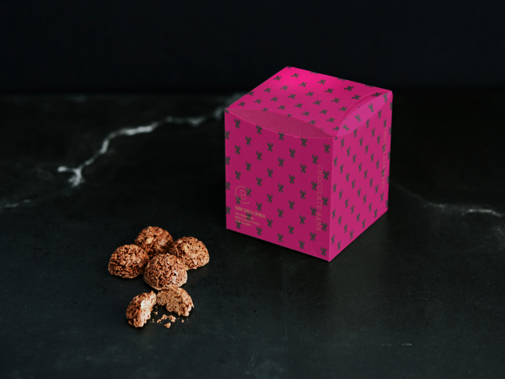 「BANK チョコクランチ」10個入り(税込1620円)は、コロンビア産カカオの香りと味わいを堪能できるチョコクランチ。キャラメルやナッツの風味を持つまろやかなミルクチョコレートと、カカオのフルーティーな味わいが特徴のビターチョコレートがブレンドされています。ザクザクの食感となめらかな口溶けの両方を実現するため、カカオバターも加えているそう。パッケージにはチョコレートバンクの目印、ゴリラが描かれています。