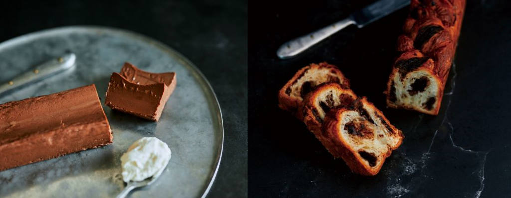 国産の発酵バターを使用したサクサク食感のクロワッサン生地に、厳選したチョコレートをたっぷりと練りこんだ食パン。砂糖は徳島県岡田製糖の和三盆を使用。
