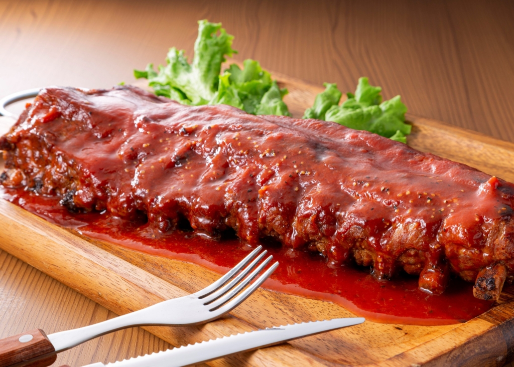 「バッファローバックリブ」(グランデサイズ 4,378円/レギュラーサイズ 2,420円)は豪快ながら骨もはずれるやわらかさ。酸味のあるピリ辛ソースで、一度食べたらやみつきになる味です。※画像はグランデサイズ