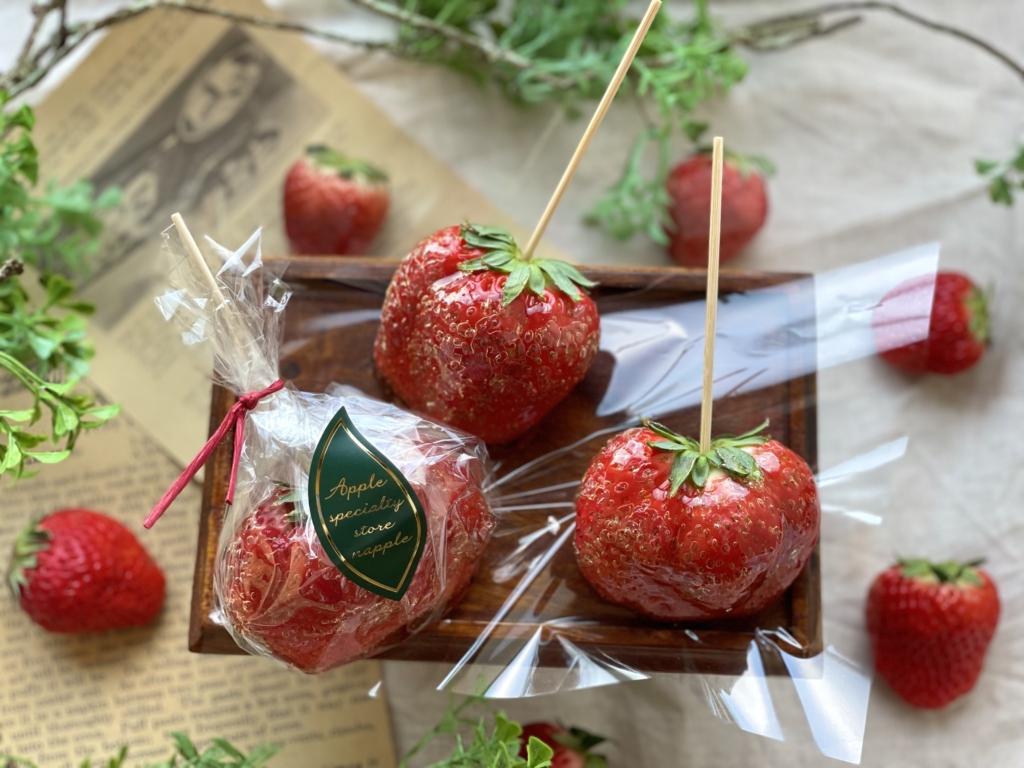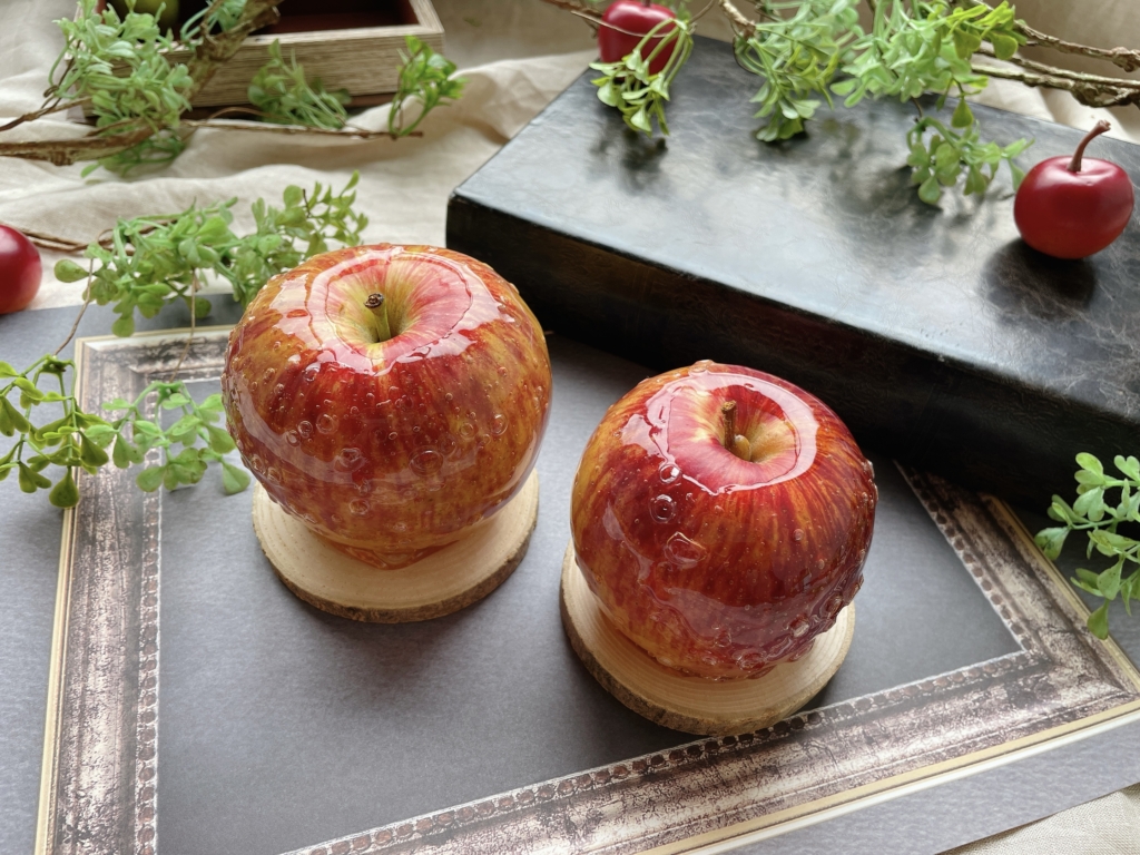 人気商品のりんご飴「ぽっぷる」は果汁100%のりんごジュースを飴に使用。りんご本来の色味も楽しめるよう、あえて着色をしないのがこだわりです。りんごの品種による味の違いが感じられ、その姿はガラス細工のようにキラキラと輝き、時間の経過とともに琥珀色に変化することから「黄金のりんご飴」とも呼ばれているそう。