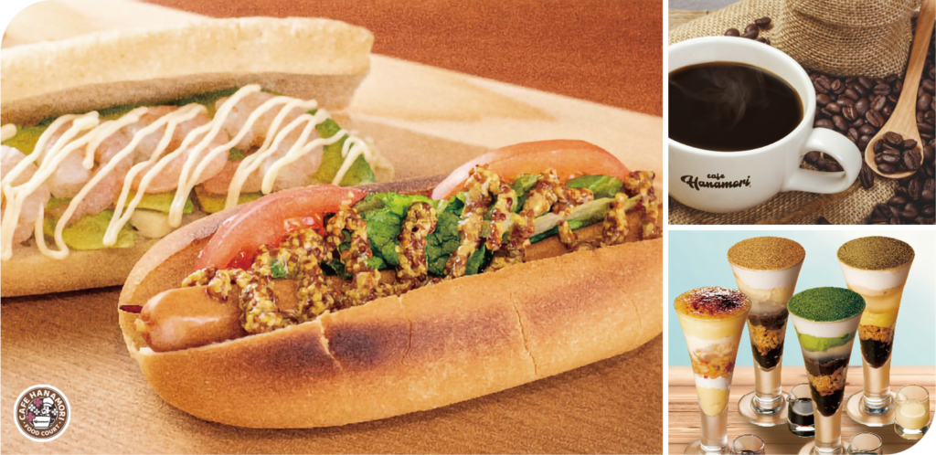 モーニング〜カフェタイムは竹炭で焙煎した『竹炭焙煎珈琲』、お好きな具材を選んでオリジナルホットドッグがつくれる『カスタムドッグ』、Hanamori名物〈生〉わらび餅を用いた『生わらび餅たっぷり祇園パフェ』などがいただけます。優雅なコーヒータイムを過ごせそうですね。