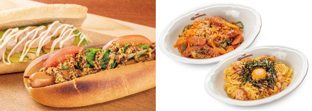 〈左〉カスタムドッグ〈右上〉喫茶店のナポリタン〈右下〉濃厚明太カルボナーラ
