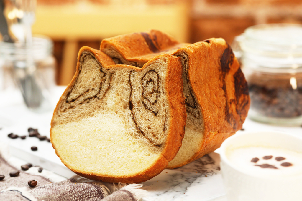 冬のあったかドリンク・カプチーノをイメージして、ミルクの甘味が優しく引き立つプレーン生地とコーヒー風味の生地を合わせた『ねこねこ食パン』。2つの生地で表現した、はちわれ模様がかわいいですね♪