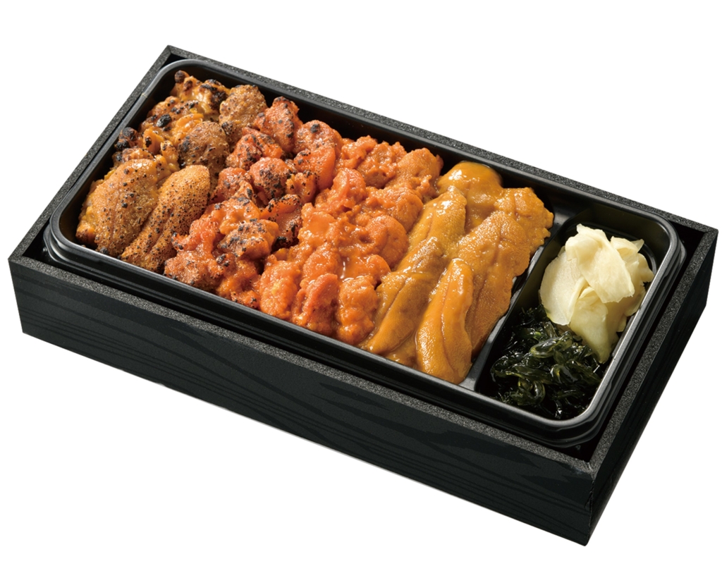 「うに専門店 世壱屋」の「ウニづくし弁当(4,320円)」は、蓋をあけたらびっしりとうにが敷き詰められている豪華弁当です。バフンうにとムラサキうにが、それぞれ半生と炙りで楽しめるので味の違いを食べ比べてみるのもいいですね。