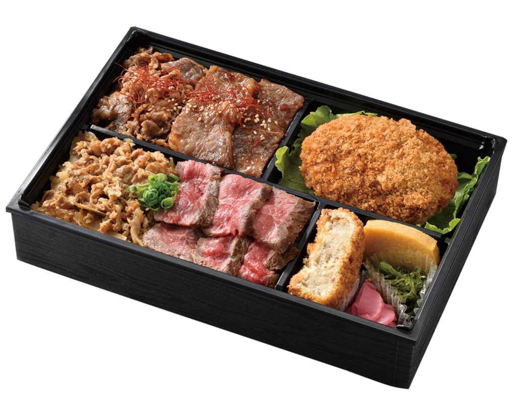山形県のブランド牛・米沢牛が堪能できる、「米沢琥珀堂」の「米沢牛づくし弁当(4,536円)」。ステーキ・焼肉・すき焼き・牛カツの4種類で米沢牛が味わえます。「肉をがっつり食べたい!」という方におすすめですよ♪