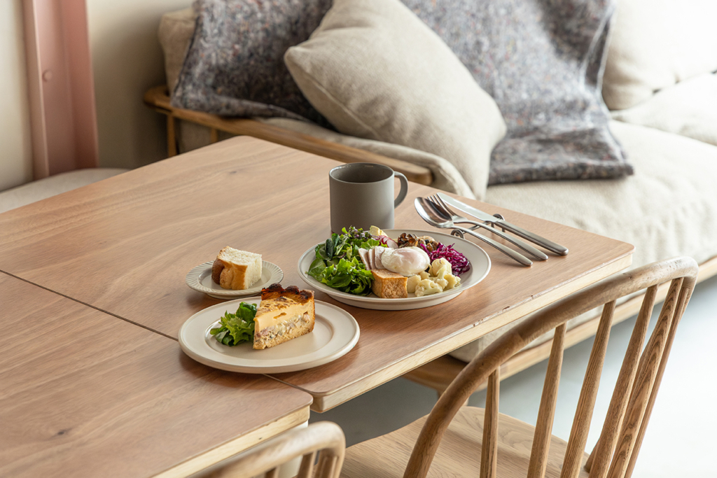 左から「きのことベーコンのキッシュ」「低糖質自家製パン」「ファーマーズプレート」