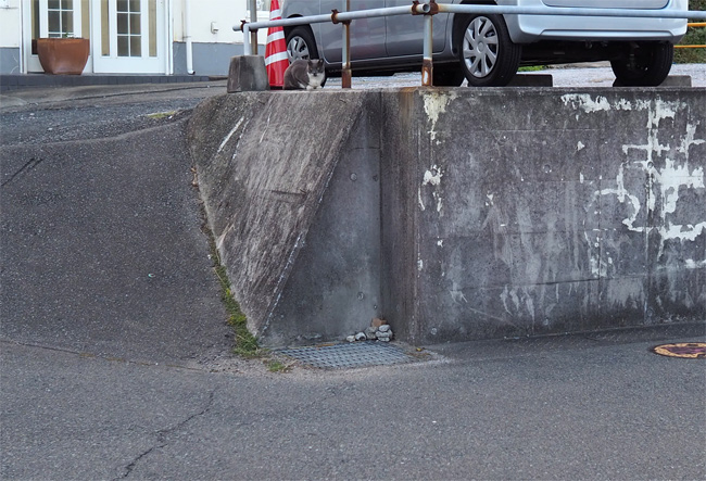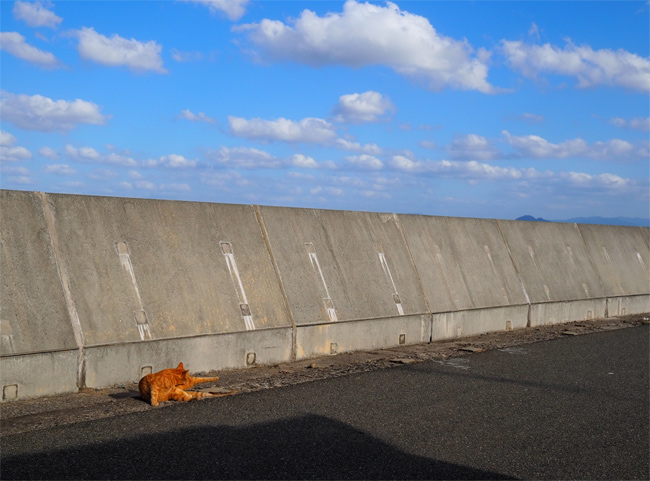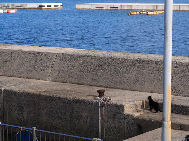 フェリーに向かう途中の道、フェリーを見る猫さんです。