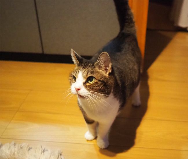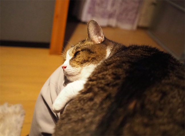 茶トラさんが夕日を浴びています。赤猫と呼ばれることもあるようですが、ちょっと分かる気がしますね。