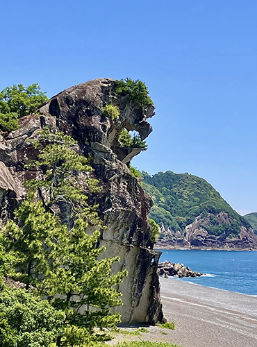 鬼ヶ城を抜けると、延々と続く浜辺が美しい七里御浜。そして、獅子が吠えているかのような獅子岩。夏草が鬚のように生えていたのはご愛敬。