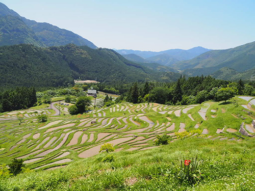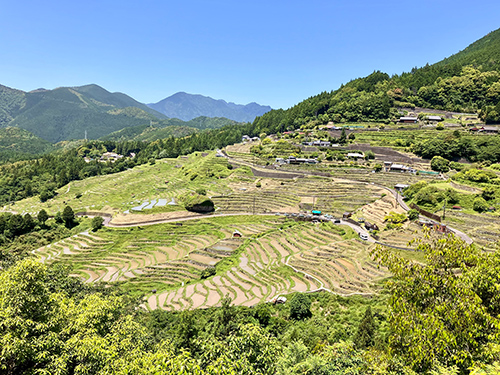 世界遺産ロードを離れ、少し内陸の丸山千枚田へ。さすが日本の棚田100選、貫禄の美しさ。田植え後の青々とした田んぼ風景に心癒される。