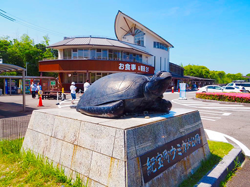 再び海辺の国道41号に戻り、南紀方面へ。紀宝町はうみがめの町。紀北町のマンボウに続いて海の生物をテーマとする道の駅。悠々と泳ぐうみがめを見て、三重県を後にした。