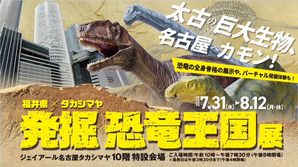 世界三大恐竜博物館のひとつである「福井県立恐竜博物館」と福井県の特別協力のもと、「福井県×タカシマヤ 発掘 恐竜王国展」が2024年7月31日(水)~8月12日(月・祝)の期間、ジェイアール名古屋タカシマヤで開催されます。5つのゾーンを巡りながら、恐竜の楽しさと魅力に迫る展覧会です♪