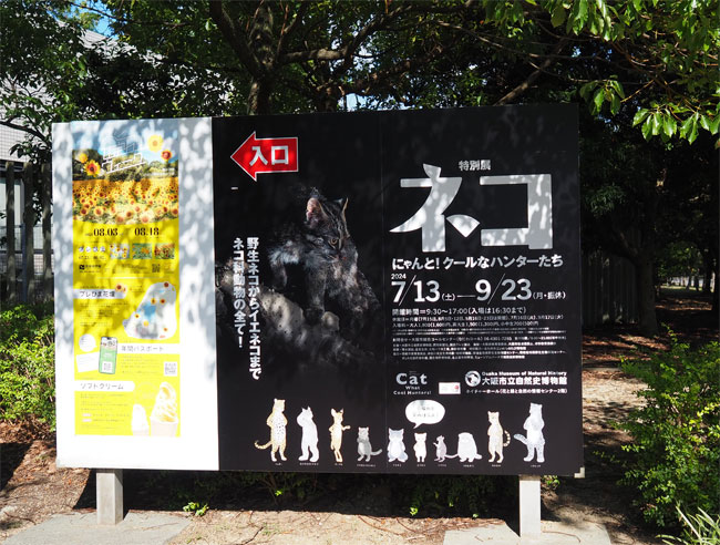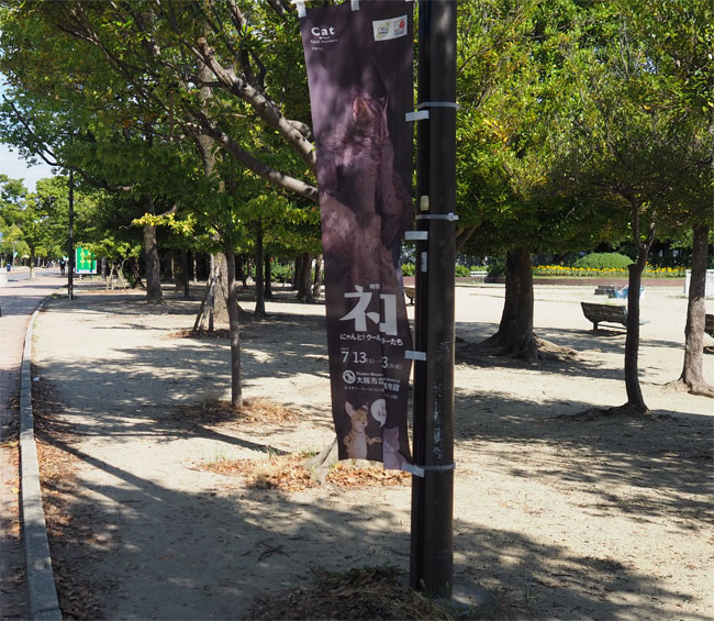 長居公園内にある大阪市立自然史博物館で「特別展 ネコ~にゃんと!クールなハンターたち~」が開催されており、行ってみることにしました。公園内の道路脇にはのぼりが立っていて目立ちます。