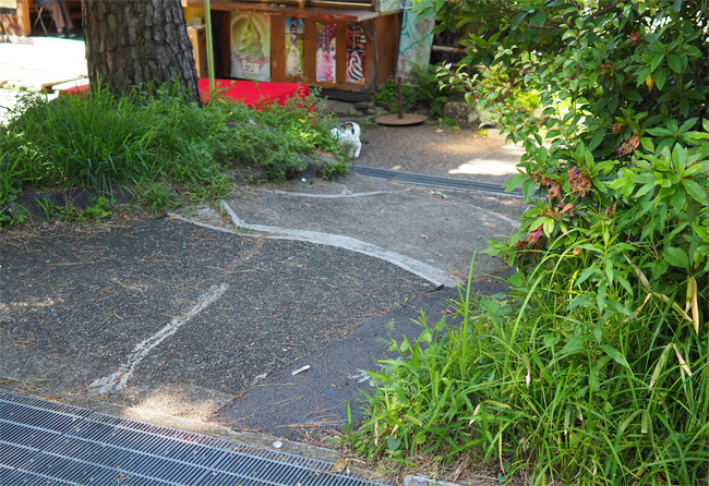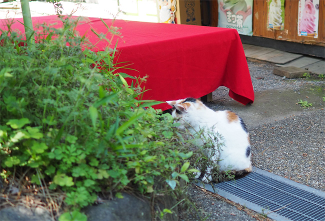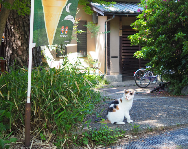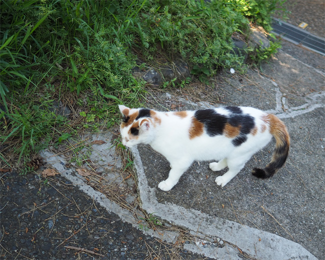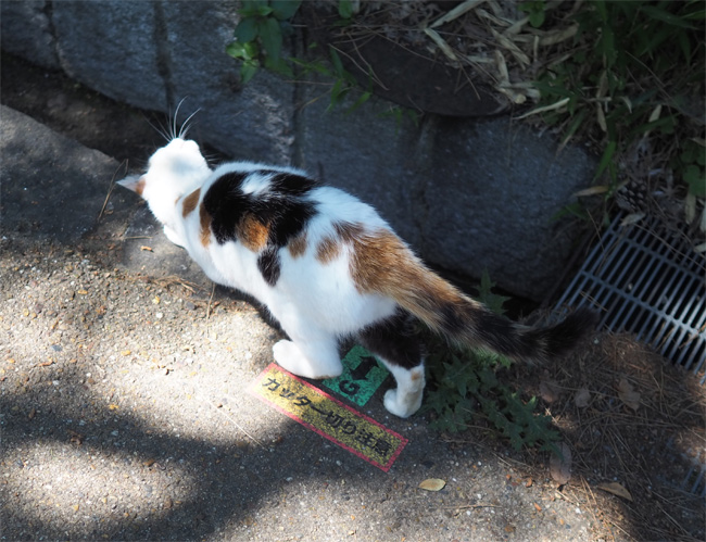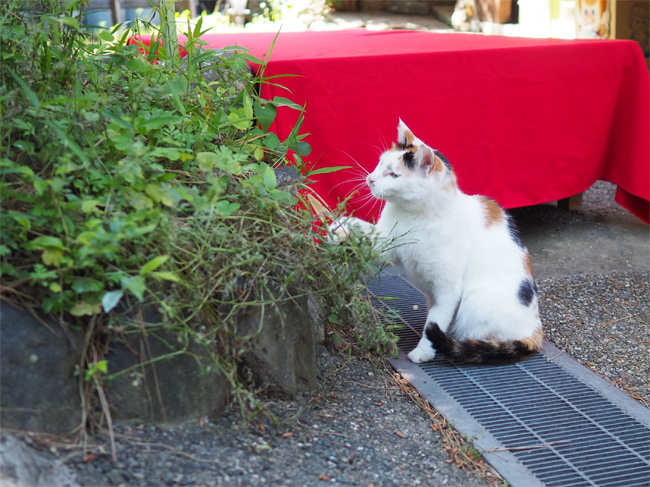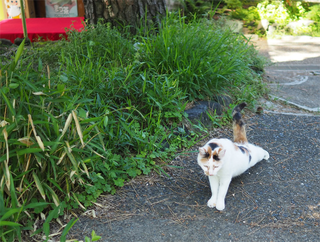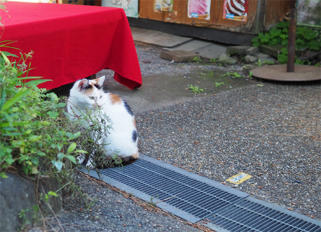 ベンチ猫さんを見送って少し歩くと、お茶やさんの近くに三毛猫さんんが見えます