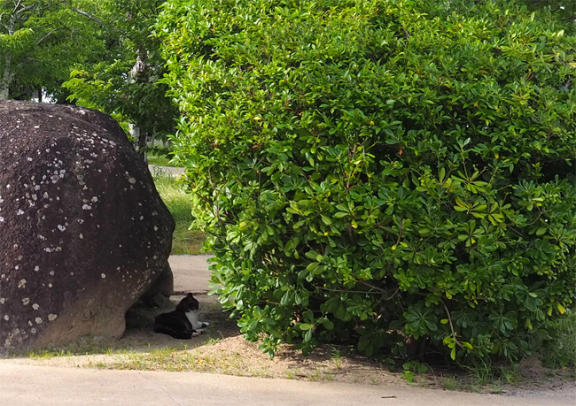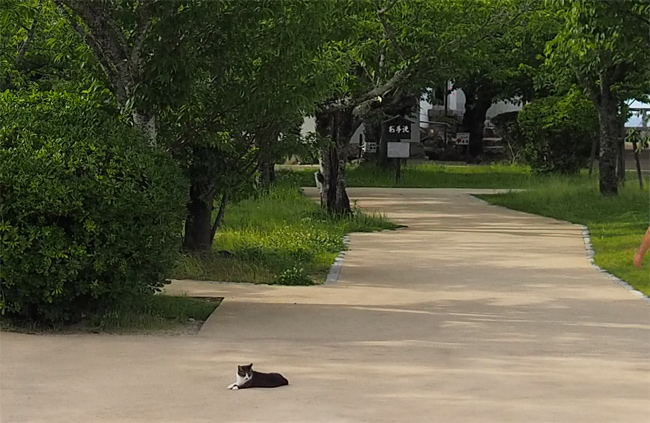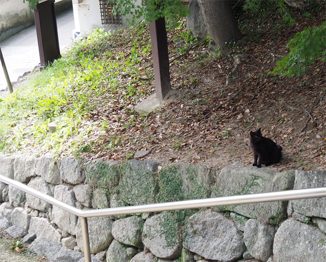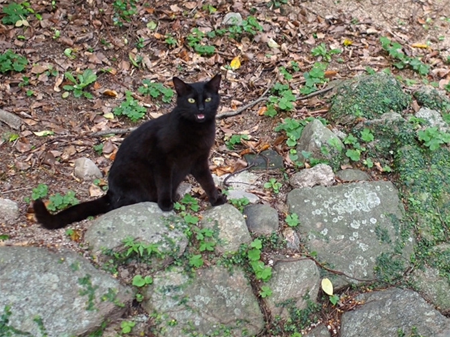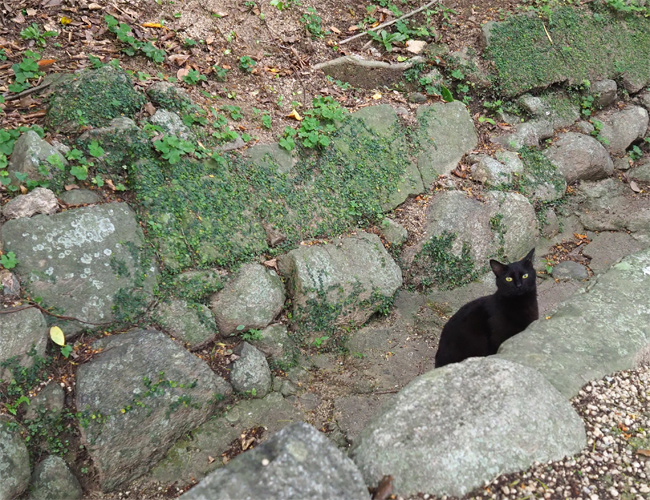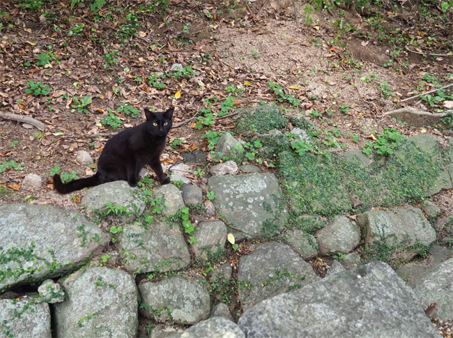 溝の向こうにいらっしゃる黒猫さん、こちらに気付くと