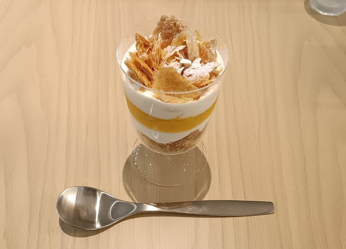 白とレモンイエローの層が美しい夏季限定パフェ。さくさくのパイ、バニラの香るホイップクリーム、甘酸っぱいレモンクリーム、香ばしいヘーゼルナッツが織りなす味わいを、美瑛産ミルクを使用したアイスクリームと共に楽しめます。