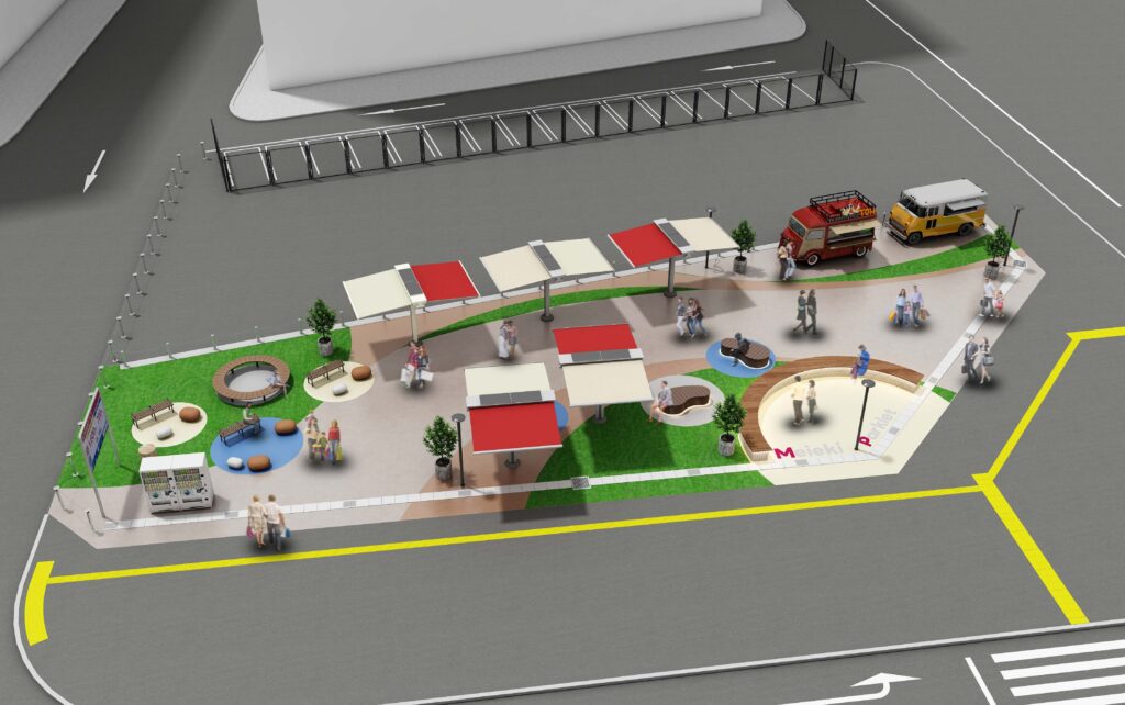 人々が気軽に立ち寄れる休憩場所として、エリア内にベンチやテーブルが整備されています。最大3台のキッチンカーが並び、“食べる・集まる・話す” が自然に生まれる賑わいの場です。