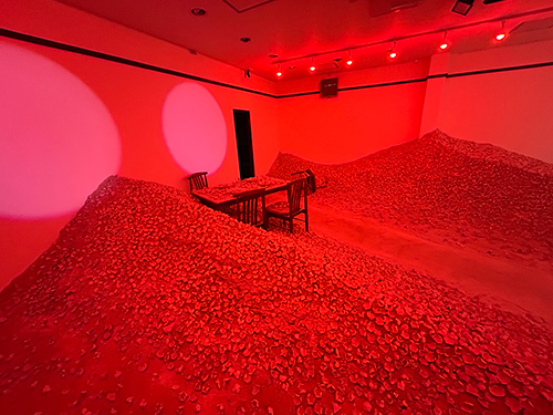 商店街には、元八百屋の空きスペースを活用した作品。瀬戸の土を使って作られた1万4千個もの花が旧店舗のなかに飾られる。決して華やかではないこの静かな花たちの姿が訴えるものは本芸術祭のテーマに繋がる。