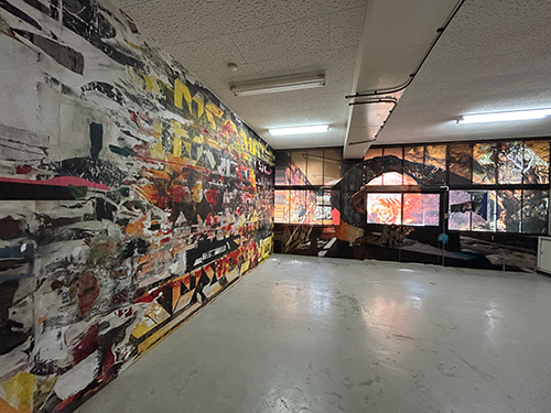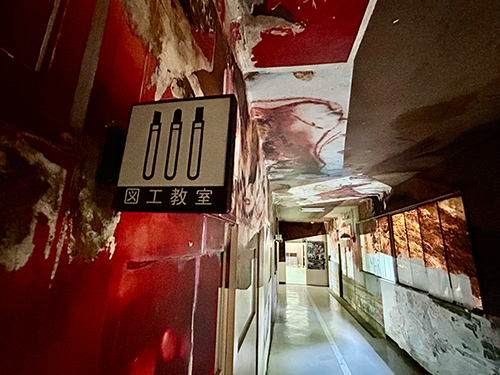 まちの中心部と言えるであろうエリアに残された廃校。過疎地の廃校アートはいくつも見たが、住宅街の廃校活用アートは初体験かも知れない。小学校の1階フロアのほぼ全スペースを使った壁紙による作品。テーマは「地球の詩」。教室、理科室、給食室、休憩室など、あらゆる空間を使ったダイナミックな展開に圧倒される。