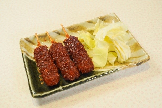 屋台でどて鍋にドボンとつけたところがルーツといわれている「みそ串かつ」。串かつ特有のサクサク感とみその香りとロース肉の旨味が楽しめます。