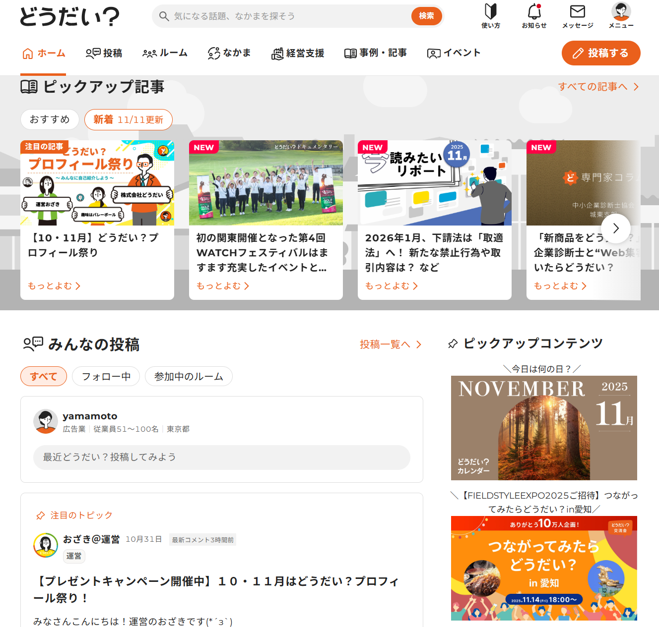 「どうだい?」は、大同生命が2022年3月に提供開始した中小企業経営者向けのウェブコミュニティです。孤独になりがちな経営者が地域や世代を超えて意見交換できる場として、現在、会員数は10万人を超えています。完全無料で利用可能なこのプラットフォームには、40~50代の経営者を中心に、サービス業、建設、小売、製造など幅広い業種の事業者が参加。事業相談から事業承継の悩みまで経営者ならではの交流が活発に行われ、オフラインイベントも多数開催しています。今回開催される「FIELDSTYLE EXPO 2025」の「どうだい?」ブースでは、このコミュニティの活動を体感できます。同じ立場の経営者との出会いや、新たなビジネスのヒントが得られるかもしれません。