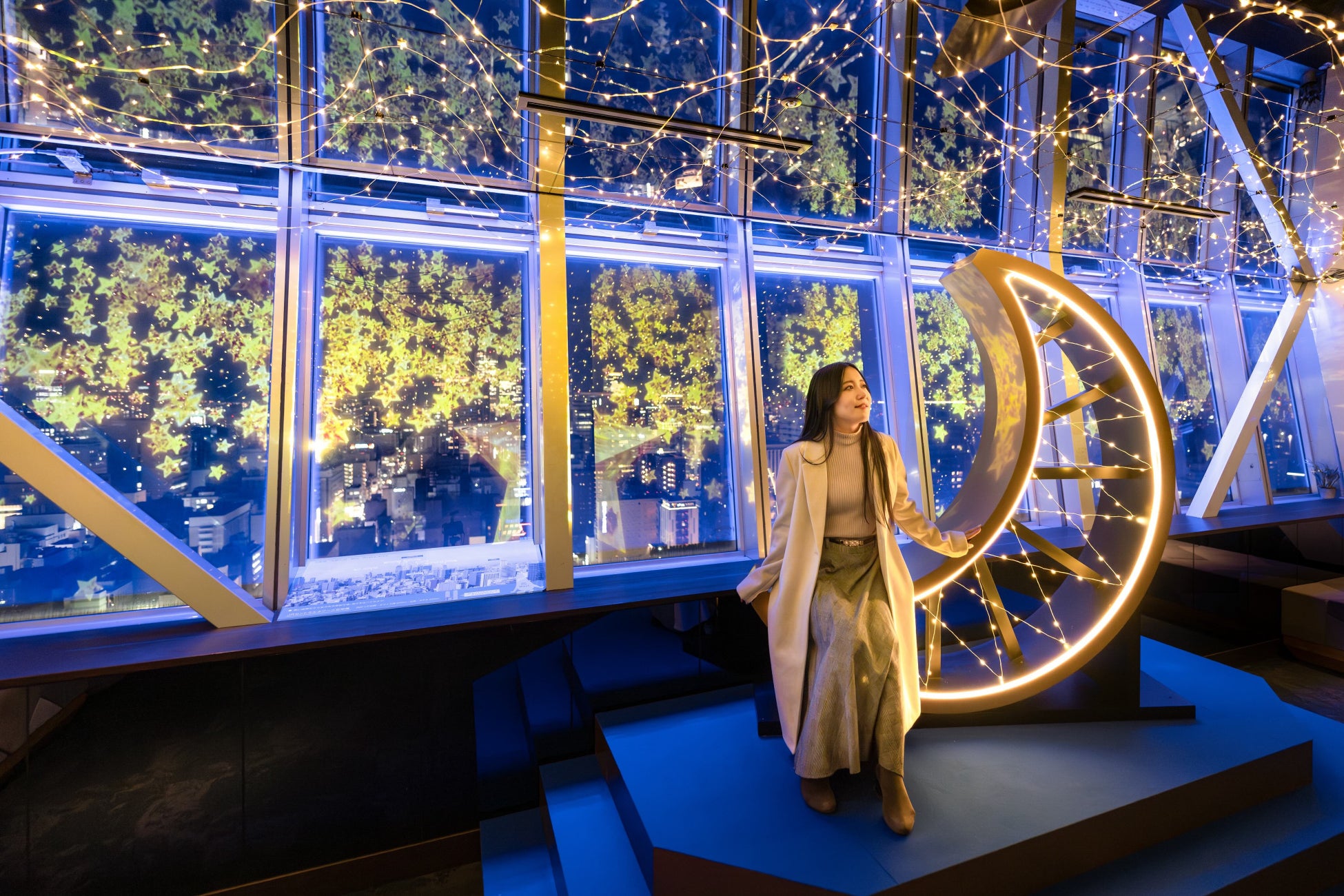 メイン演出エリアとなる、地上90mの展望台「スカイデッキ」では、窓面全体に星座や流れ星が次々と現れるプロジェクションマッピングショーはもちろん、星空が降るような没入感を感じられるイルミネーションが天井に新登場。マッピングショーと連動したイルミネーションの光が、名古屋の夜景を華やかに彩ります。