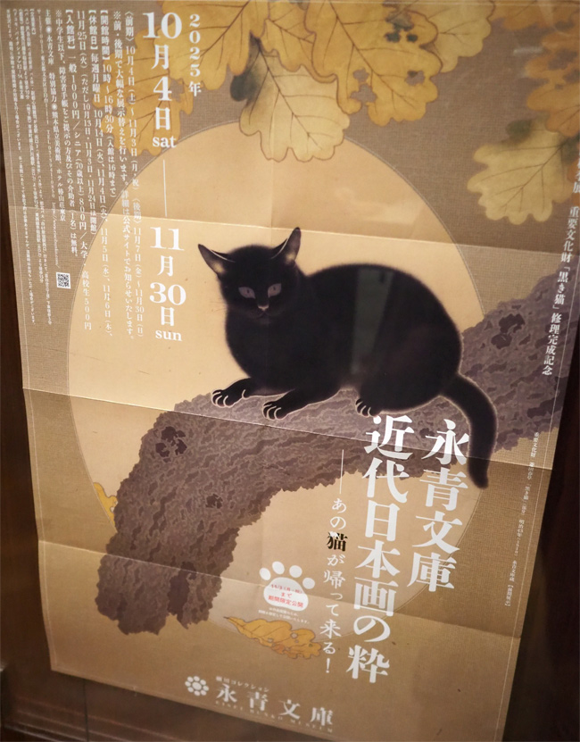 翌朝、見かけたポスター「あの猫が帰って来る!」のコピーと、爪研ぎを始めそうなこの黒猫さんのポーズと耳が秀逸です。いけなかったのが残念・・